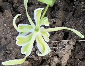 Один из самых необычных махровых подснежников с тремя длинными вытянутыми лепестками, с туманной зелённой птичкой на конце.